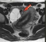 El endometrioma aparece como una formación redondeada con un doble contorno y una estructura hipoecoica uniforme que se asemeja a un vidrio opaco. No se observan inclusiones densas. La cápsula consiste en un 30% de focos hipoecoicos. No hay flujo sanguíneo interno.